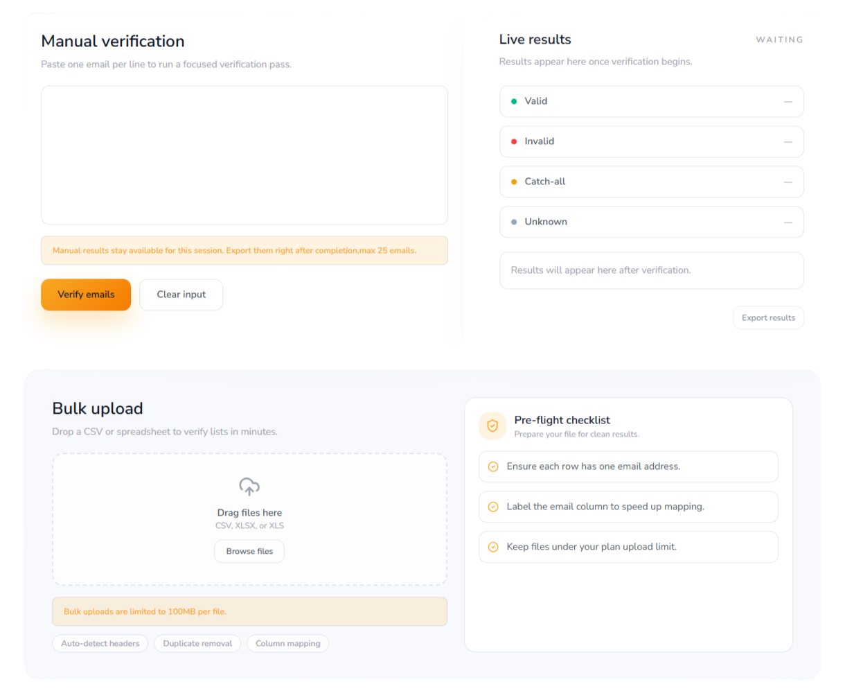 Most tools label catch‑all domains as “unknown” and bill you anyway. BoltRoute flags catch‑alls clearly so you can decide how to route them—send cautiously, retry later, or exclude.