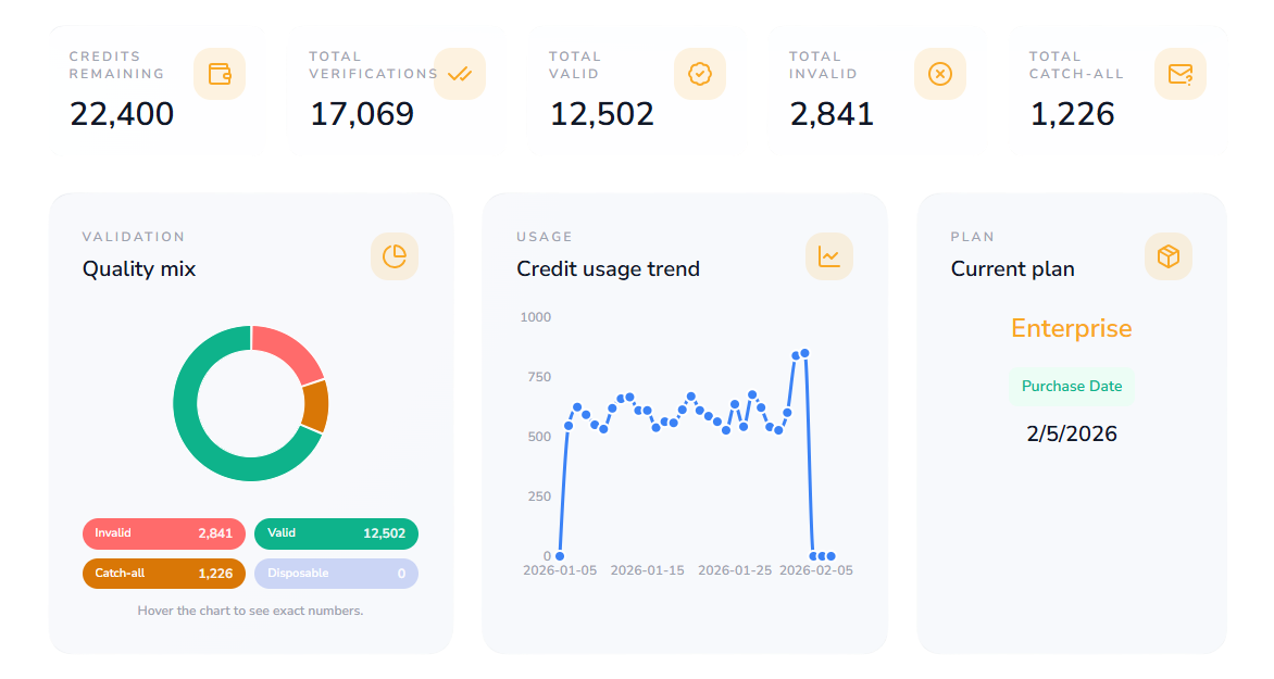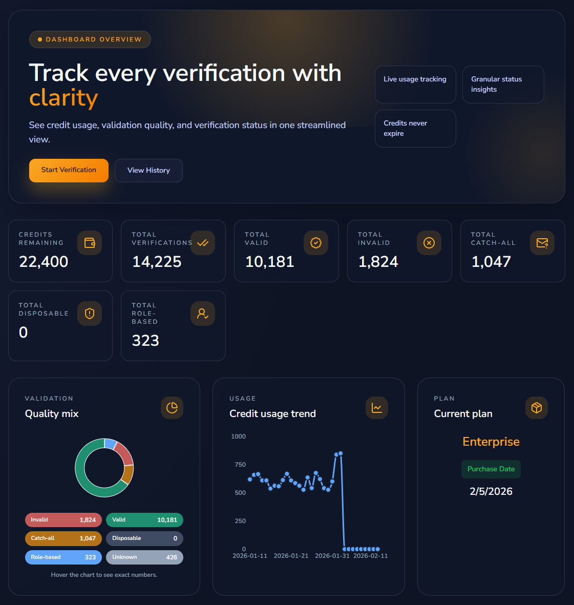 Track verification quality with clarity. See your status mix, credit usage, and verification history in one view.